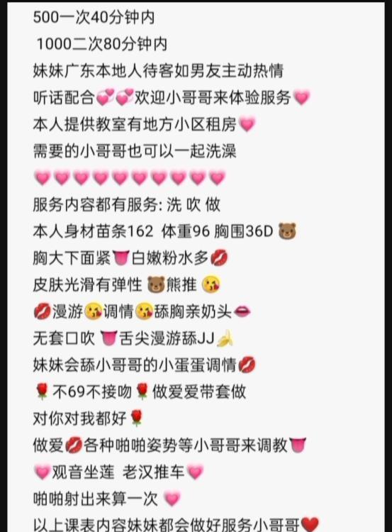 详细介绍:我一直不太喜欢简单的洗吹做……感觉这样还不如自己看个片子打飞机来的爽快。偏偏遇到了。我是通过微信约的,本来约的妹子说是广东的,结果去到教室却发现是刚到深圳的杭州妹子。我想着来都来了,妹子颜值我也不抗拒、就上课吧。结果课表上的陪洗澡没有,也不可以亲奶子。我洗完澡之后她上来就直接舔我一小会,然后简单吹了一下二弟。立马就让我带套开干了……我愣了一下,这就直接来了?我立马没有了性趣……,心想这次别想有什么体验了,草草的干了一会,拔屌洗澡走人。大家看到这个课表的……要谨慎呢。感觉都是兼职,体验不敢保证。这次体验之后,我感觉以后还是选择环保课的体验会好一点